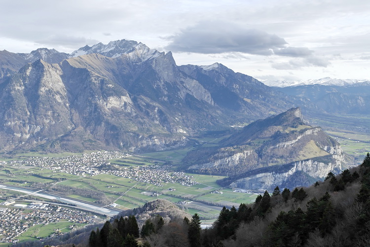 Gauschla und etwas rechts oberhalb der Bildmitte der Gonzen über Sargans, etwas weiter entfernt: der Eisgipfel des Tödi.