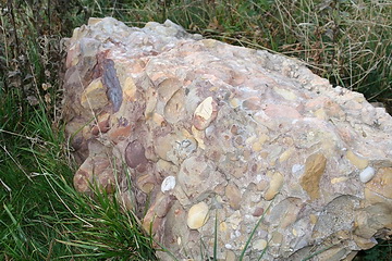 Konglomerat aus versteinerten, untermeerische Erdrutschen, Flysch oder Nagelfluh genannt. Conglomerate of fossilized submarine landslides called Flysch or Nagelfluh. |