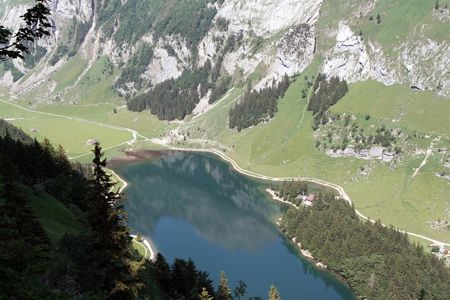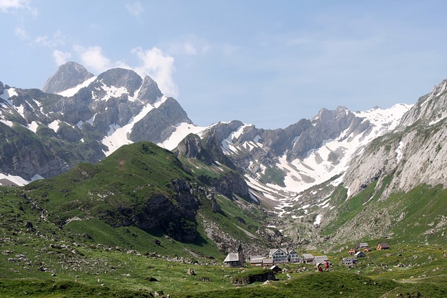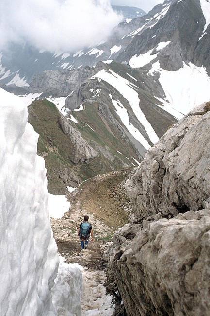At this time of the year (June) you'll also find snow covered passages. In the background the summit of Altmann (2436 m).