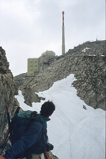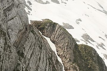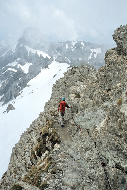 The first rock part after leaving the summit of Saentis leads to the top of Chalbersaentis (2377 m) and is already belayed by wire cables. A final look back to the summit of Saentis which we do not mind leaving behind.