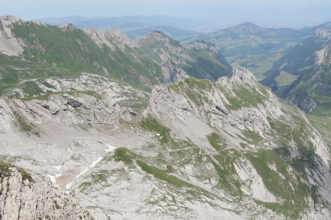 Der erste Anstieg nach dem Säntis führt auf den Chälbersäntis (2377 m) und ist bereits mit Drahtseilen gesichert. Ein letzter Blick zum Säntisgipfel, den wir gerne hinter uns lassen.