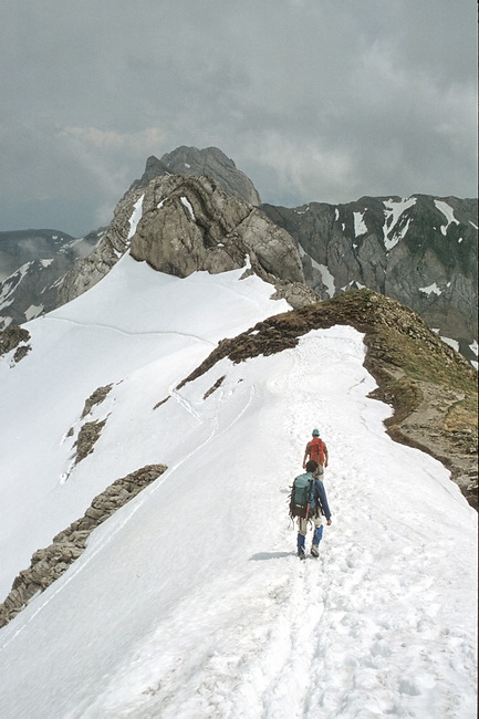 Am Lisengrat wechseln sich um diese Jahreszeit (Juni) Felspassagen und Schneegrate ab. Im Hintergrund der Altmann (2436 m).