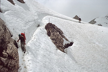 Nach dem Schneegrat folgt eine weitere Felspassage. The snow ridge is followed by another rock passage. |