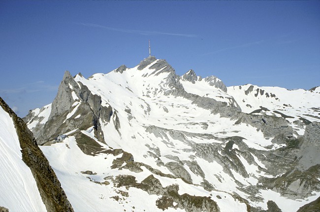 Der Lisengrat, aufgenommen vom südlich gelegenen Jöchli. Wer den Lisengrat im Frühsommer begehen will, sollte sich auf jeden Fall vorher nach Schneeverhältnissen erkundigen.