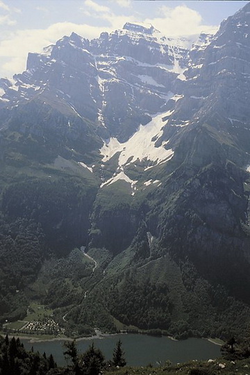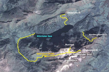 Klöntal Lake is situated 350 m above the town of Glarus and surrounded by steep rock walls. In northern direction the summit of Dejenstock is towering 1100 m above 'lake' level. Still 1000 m higher are the highest peaks of the Glärnisch massif. Both hikes described here start at the eastern end of the lake an take us to Dejenstock in northern direction and Vorderglärnisch directly opposite. They include spectacular views down to the lake and should only be done by experienced hikers with sufficient alpine experience in steep terrain and good sense for orientation.