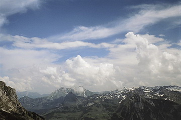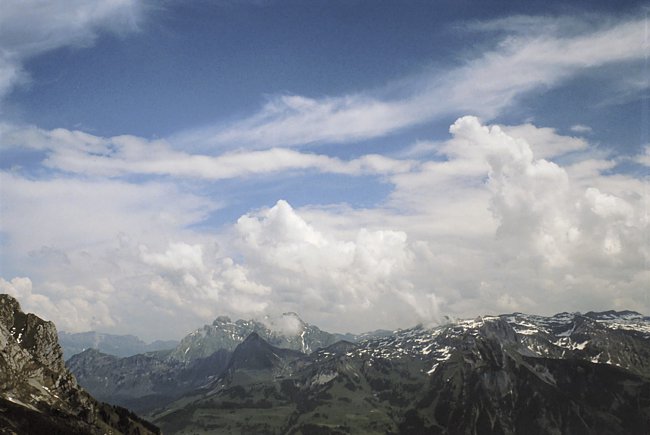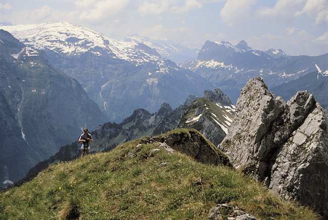 Blick nach Nordosten zum Mürtschenstock. Direkt davor der Fronalpstock am Eingang des Linthtales. Summit view in northeastern direction towards Mürtschenstock and Fronalpstock in front of it. |