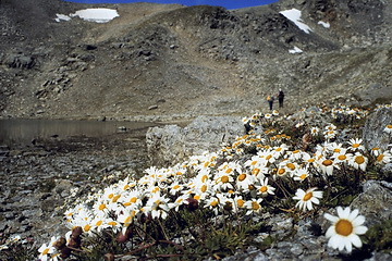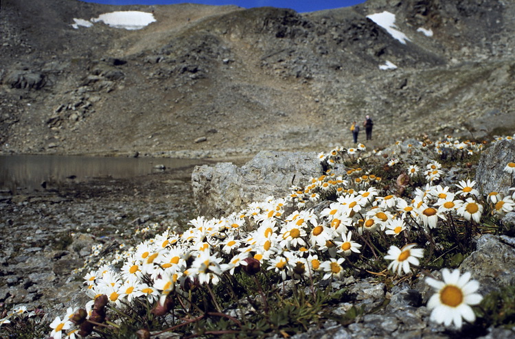 A carpet of flowers near the lake below Sesvenna Saddle.