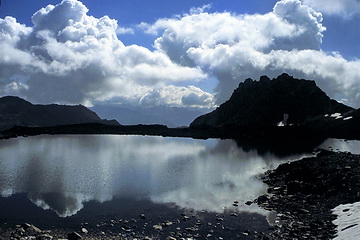 Der Weg zum Piz Sesvenna führt zunächst auf das Sesvennajoch, das man nach einer Stunde Aufstieg von der Sesvennahütte erreicht. Kurz vor dem Joch befindet sich ein kleiner Bergsee in dem sich der Föllerkopf spiegelt.