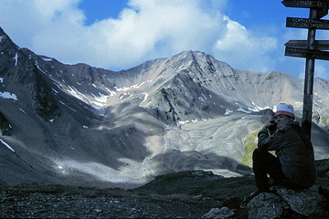 Rast am Sesvennajoch. Die Schuttströme zeigen das Ausmass früherer Vergletscherung. In Bildmitte der Piz Plazer (3104m ) westlich des Piz Sesvenna. Vom Sesvennajoch kann man den gesamten Gletscheranstieg erkennen. Man quert den Gletscher diagonal von links unten (kurzer Abstieg vom Joch) nach rechts oben. In der Einsattelung ganz rechts betritt man den Blockgrat zum Sesvenna Gipfel. Links der Muntpitschen (3162 m).