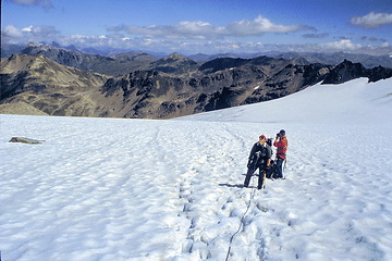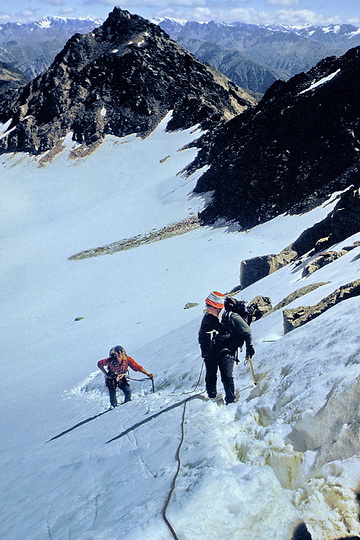 As long as the glacier is covered with snow there are no difficulties to get back on the rock ridge leading to the summit. The ridge itself requires caution.