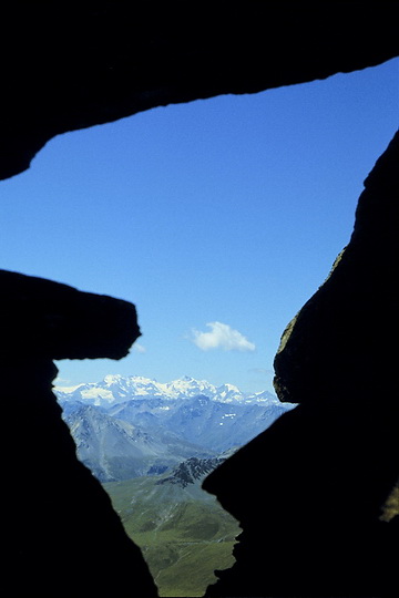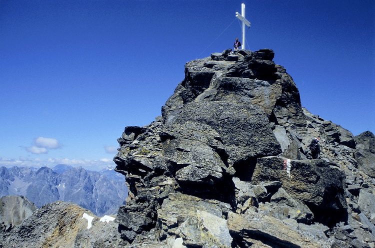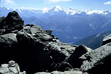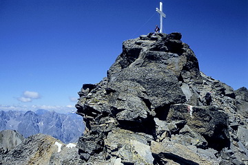 The summit rock of Piz Sesvenna (3205 m) which is climbed from the right side after a short traverse. The Ortler Massif taken from the summit of Piz Sesvenna in south-eastern direction.