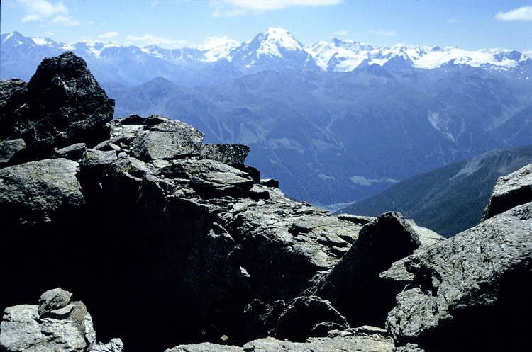 Gipfelblock des Piz Sesvenna (3205 m). Der Aufstieg erfolgt nach einer kurzen Querung über Blockwerk von rechts. Blick vom Gipfel des Piz Sesvenna nach Südosten zum Ortler.