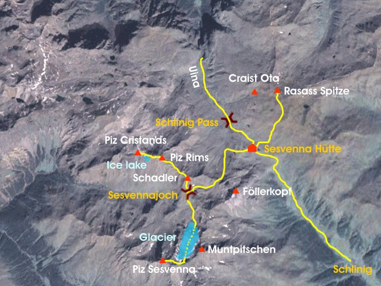 Der Namensgeber und zugleich höchste Punkt der Sesvennagruppe ist der Piz Sesvenna (3025 m) selbst. Wie bei der Besteigung des Piz Cristanas führt die Anstiegsroute auch hier zunächst zum Sesvennajoch und danach auf den kleinen Gletscher, der zum blockigen Gipfelgrat führt.