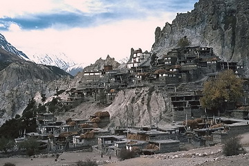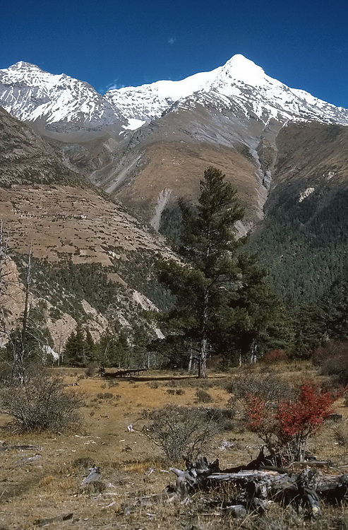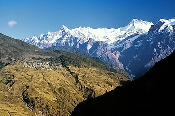 The village of Pisang (~ 3200 m) - half way between Khudi and the Thorong Pass with Chulu West (6419 m) and Chulu East (6584 m) behind. From there Pisang Peak (6091 m) can be climbed.