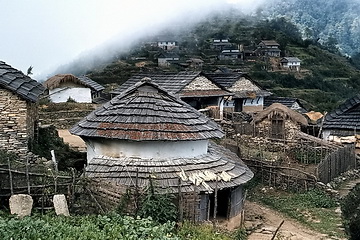 The village of Ganpokhara ( ~ 2200 m) situated upon the Telbrung Danda from where we descended to Khudi ( ~ 780 m) in the Marsyandi Valley. Evening view to 'Peak 29' (7835 m) and Himalchuli (7893 m