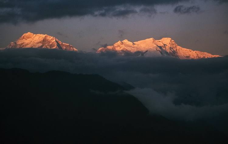 Der Ort Ganphokhara, ca. 2200 m hoch auf dem Telbrung Danda gelegen, von wo aus wir nach Khudi (ca.780 m) ins Marsyandi Tal abstiegen. Abendstimmung mit 'Peak 29' ( 7835 m) und Himalchuli (7893 m).