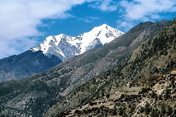 Between Pisang and Sabche - View back to Pisang Peak (6091 m). The village of Braga with Tilicho Peak (7134 m).