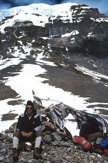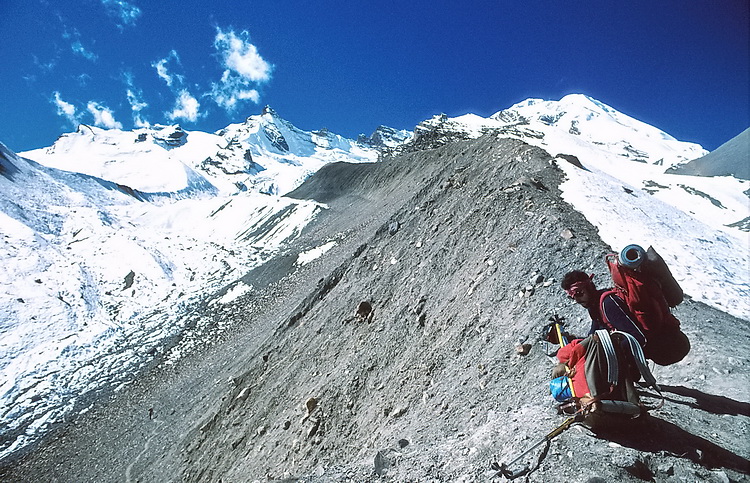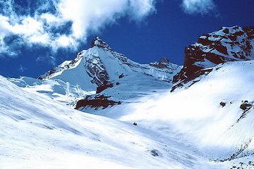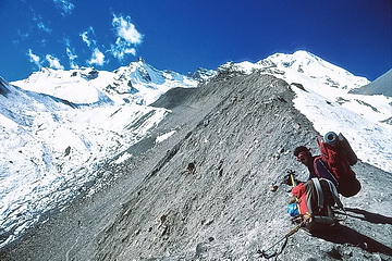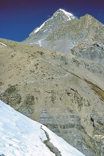 Ascending the Thorong pass with Yakgawa Kang (6481 m) in the background continuing the ascent -  Muktinath Himal with Khatung Kang, 6484 m.