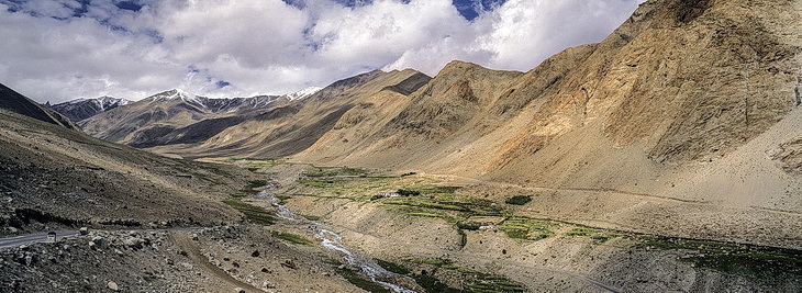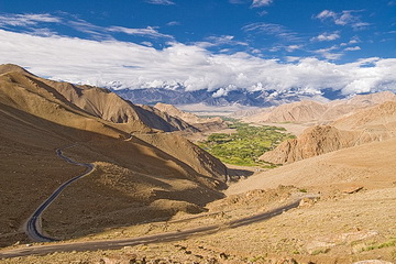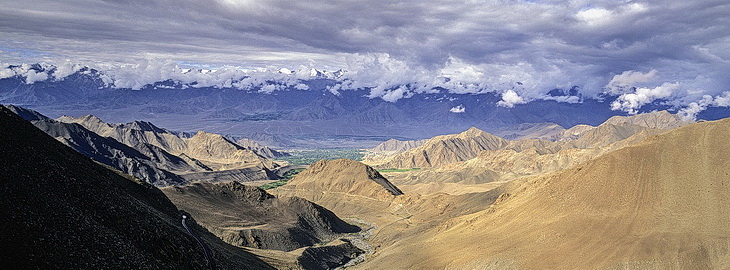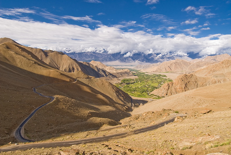 During a stop on the south side of Khardung La, looking back down to the oasis of Leh. On the other side of the Indus river we can see the village of Stok and the mountains of the Stok range.