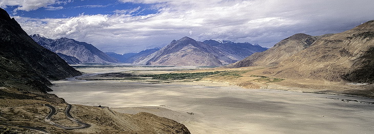 Das Tal des Shyok Flusses trennt die Ladakh Kette vom Karakorum. Von rechts mündet das Nubratal ein, welches den Siachengletscher entwässert.