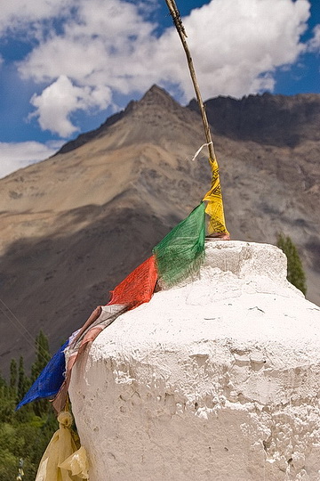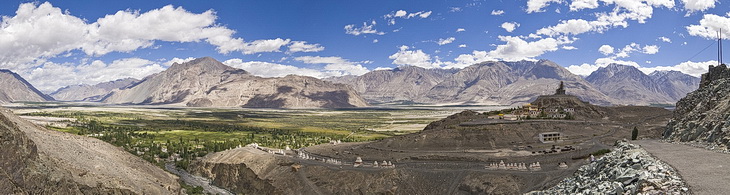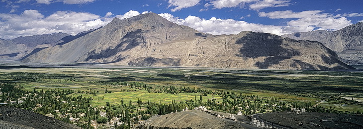 The Shyok valley is a high mountain valley (~ 3.100 m) which has been part of the silk road during the Middle Ages. Today the farmers are counting on the organic farming of fruit like apricots, apples or walnuts. Because of the height of Khardung La the Nubra valley can only be visited during summer between Mai and August. The distance between Leh and Deskit is about 120 kms.