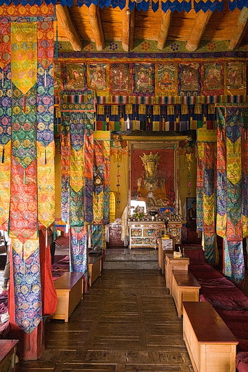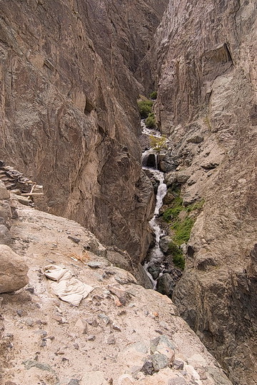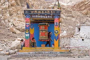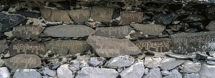 Ein steiler Weg führt hinunter in die Schlucht, aus der die Mönche früher das Wasser holen mussten. Stupas und Mauern aus Manisteinen mit dem Mantra OM MANI PEME HUNG. Die Rezitation der sechs Silben baut die Störgefühle Stolz, Neid, Anhaftung, Verblendung, Gier und Hass ab.