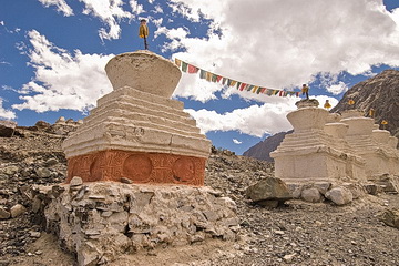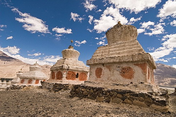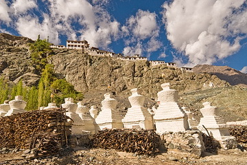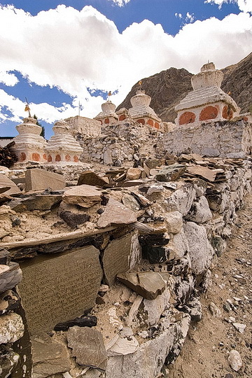 A steep path is leading down to the river - the only way to fetch water for many years. Stupas and mani walls showing the mantra OM MANI PEME HUNG, the recitation of the six syllables relieves from emotions like pride, jealousy, desire, greed and hatred.