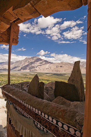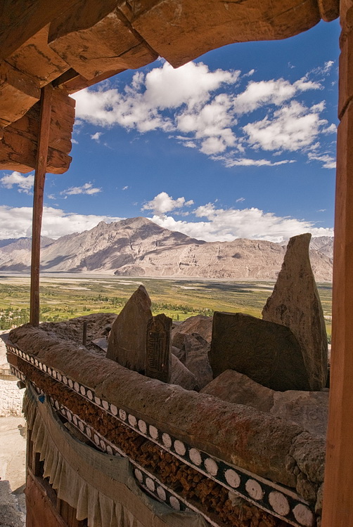 Aussicht vom Kloster Deskit nach Norden auf die Meditationshalle und das Nubratal. Unten: Thankas (Rollbilder, die der Meditation dienen) verschiedener Buddhas und ein renoviertes Fresko der Vier Weltenherrscher.