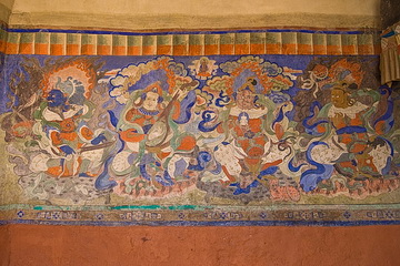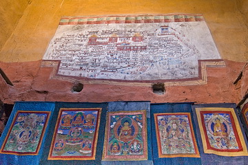 View from Deskit monastery in northern direction on the meditation hall and the Nubra valley. Below: Thankas of different Budhhas and a renovated fresco of the four ruler of the worlds.