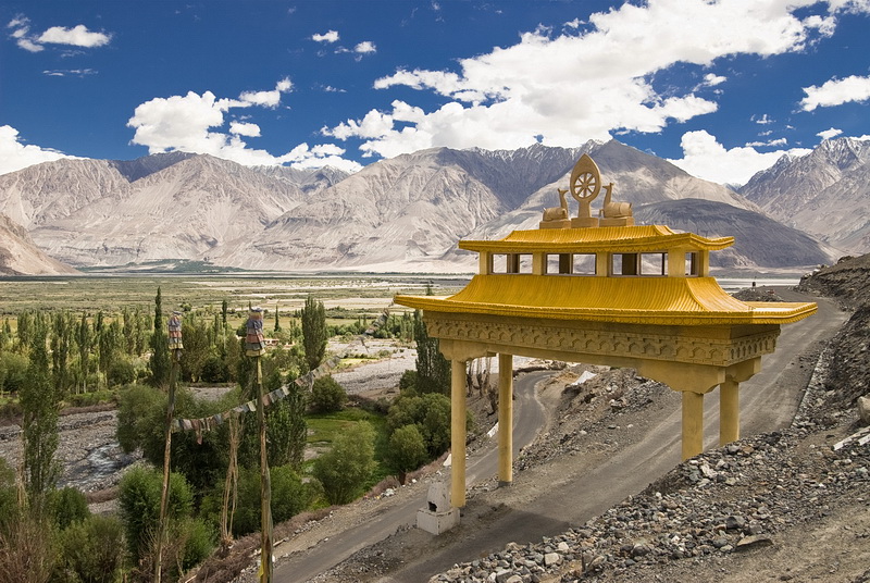 Gate Chorten and prayer wheel on the road to Hundar. The 36 m statue of the sitting Buddha Maitreya was still under construction (in 2008).