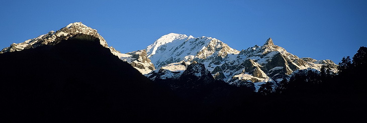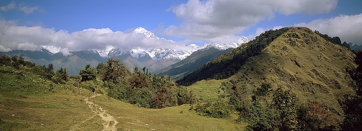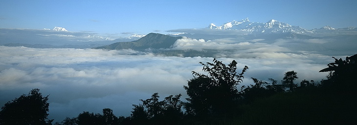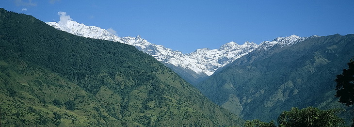 View from Gorkha towards Annapurna (left) and Manaslu Himal. This trek leads around the Manaslu Massiv in counter-clockwise direction.