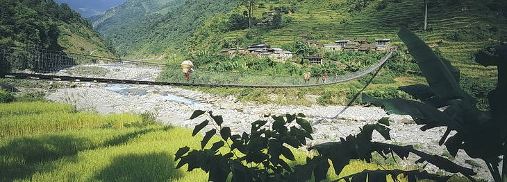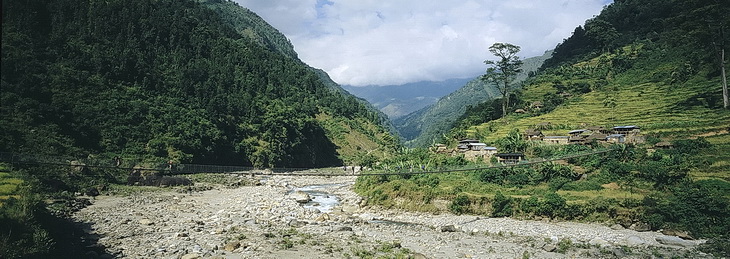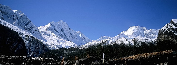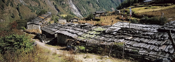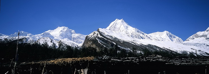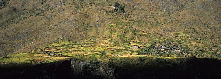 View across the Budhi Gandaki Valley between Philim and Deng and to Lapuchun (5960 m) and the Dwijen Himal.