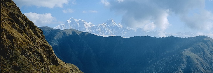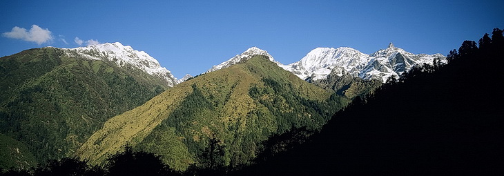 1150 Höhenmeter sind es von Lager 3 hinauf nach Barpak und das auf 2050 m liegende Lager 4. Hier sahen wir auch zum ersten Mal den Rupina La (links davon der Boudha Himal - 6672 m). Knapp 10 km nordöstlich von Barpak liegt das Lager 5 (2815 m) auf einer Almwiese.