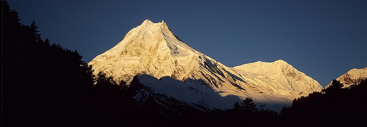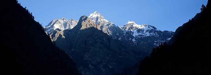 Zwischen Deng und Lho befinden wir uns in einem engen Tal, noch sind die hohen Berge nicht zu sehen. Dann allerdings erschien im Morgenlicht der Manaslu (8163 m).