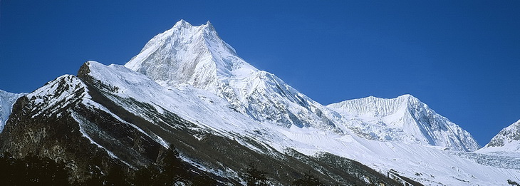 Between Deng and Lho we were following a narrow valley with the higher mountains still out of sight but then Manaslu (8163 m) appeared in the morning light.