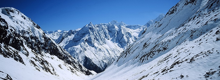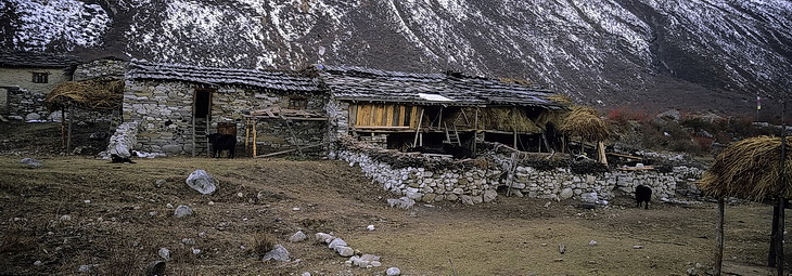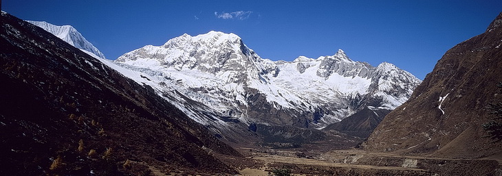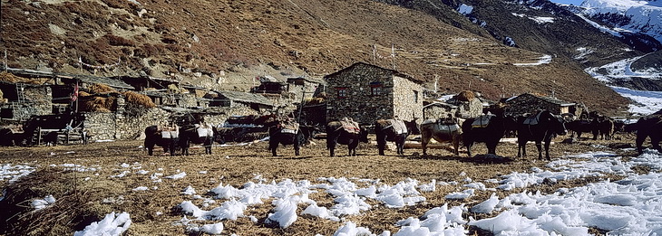 The valley of Sama (3390 m). In the background the summits of the Larkya Himal Range. In eastern direction the summits of Lapuchun (5960 m) and Shringi Himal (7187 m).