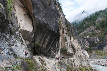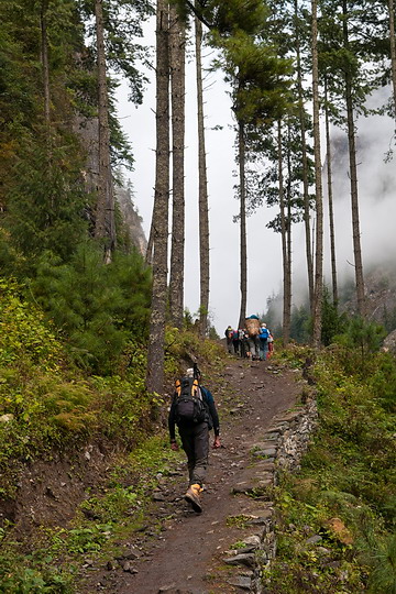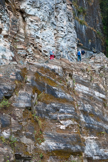 Steil führt der Weg durch alpinen Bergwald und Felswände das Naar-Phu Tal hinauf. A steep path is leading through the alpine forests and rock walls of the Naar-Phu Valley. |