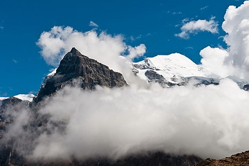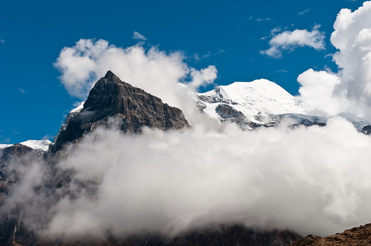 Oben links die felsige Nordflanke des Jong Ri oder Pisang Peak (6091m), ein häufig bestiegener Sechstausender. Unten links ein etwa 6400 m hoher Gipfel des Damodar Himal, rechts der Kang Guru (6981 m).