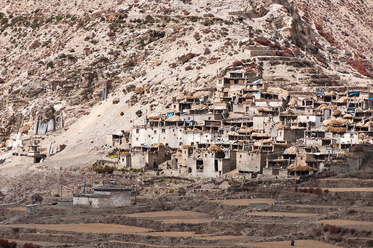 In Koto (2.600 m ) the trekking routes are dividing: one is following the Annapurna Trek to Manang and further along the Marsyangdi river to Muktinath via the Thorong La pass. We took the northern route along the Naar valley crossing the Teri La pass to Lo Manthang in Mustang. During the next two days we followed the spectacular canyon of the Naar-Phu Khola to the small village of Naar.