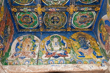 Mandalas are shown in the Gompa. The Buddhas in the right picture are a symbol of the different kinds of wisdom, the Bodhisattvas (left) show the corresponding methods. The flaming sword of Manjushri (left) is cutting the knot of ignorance, the four arms of Chenresig (center) show the devolopment of love, compassion, gladness and stoicism and the diamond (Dorje) in the hand of Vajrapani represents the indestructibility of the spirit.