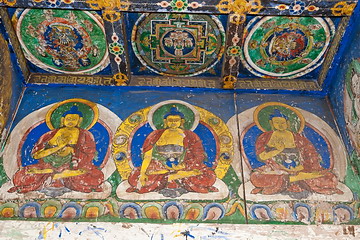 In der Gompa werden Mandalas dargestellt. Die Buddhas (rechtes Bild) sind Symbole für die verschiedenen Weisheiten, die Bodhisattvas (links) zeigen die Methoden. Das flammende Schwert Manjushris (links) durchtrennt den Knoten der Ignoranz, die 4 Arme Chenresigs (Mitte) zeigen die Entwicklung von Liebe, Mitgefühl, Freude und Gleichmut und der Diamant (Dorje) in der Hand Vajrapanis zeigt die Unzerstörbarkeit des Geistes.