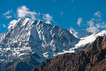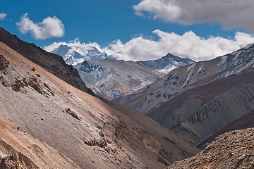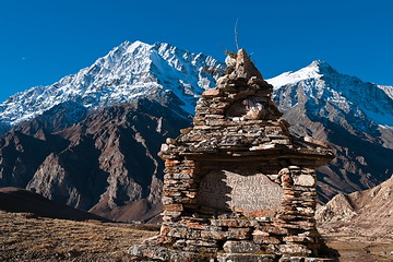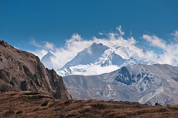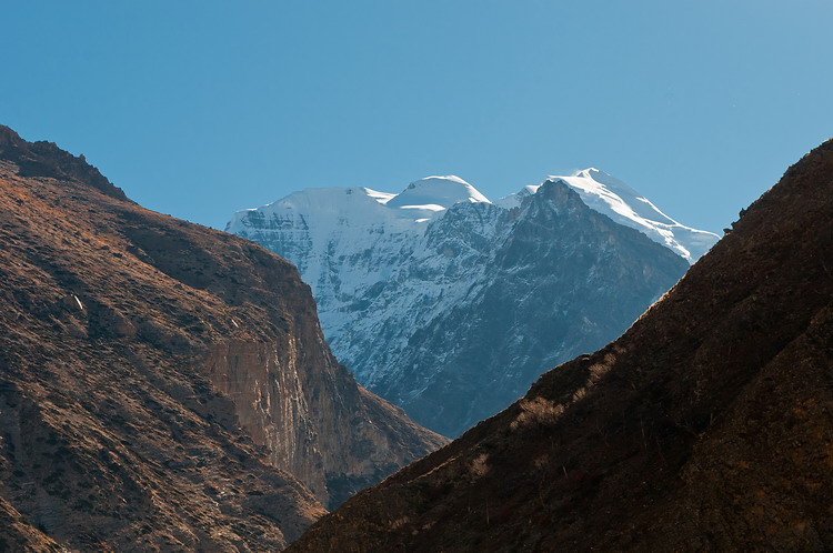 Chorten with Pisang Peak (6.091 m) behind. Further up the track also Annapurna II (7.937 m) appeared on its right side. The glacier covered peaks below are part to the Kang Guru Himal which is rising high above the Dho Khola valley.