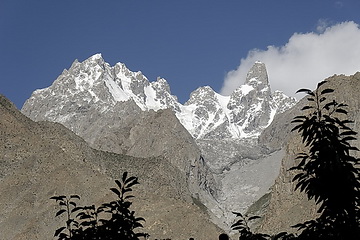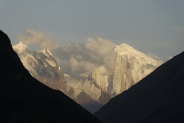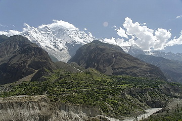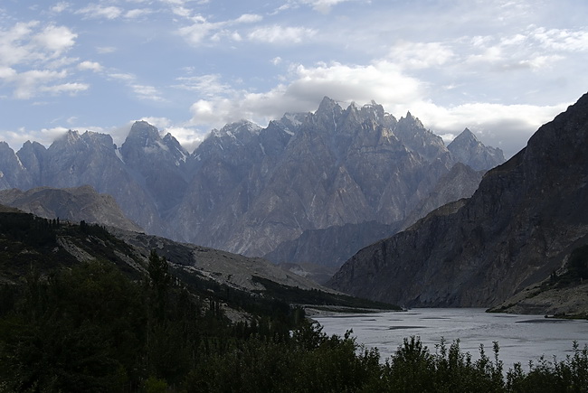 Near Karimabad Hispar Muztagh appears in north-eastern direction with Lupghar Sar (7200m), Momhil Sar (7443m) und Trivor (7720m).