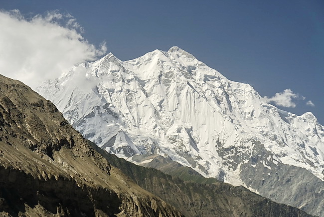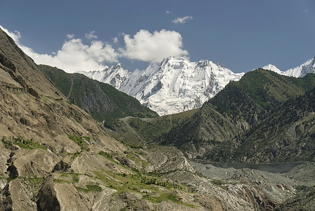 Erster Blick auf den Rakaposhi ('Fischschwanz' - 7788 m) von Westen. Der Höhenunterschied vom Hunzafluss zum Gipfel beträgt über 6000 m! Der Aussichtspunkt kommt ganz unvermittelt nach einer Strassenbiegung bei Sikandarabad etwa auf halbem Weg von Gilgit nach Karimabad. Rechts die Nordflanke der Rakaposhi, der 1958 von einer britisch-pakistanischen Expedition erstbestiegen wurde.