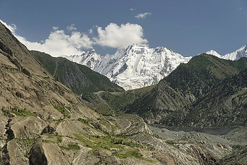 Gilgit (1.430 m) is the starting point of most undertakings and expeditions in the Karakoram Range. There are about three flights from Islamabad to Gilgit by the PIA provided that the weather conditions are acceptable. Busses are driving from Rawalpindi via Swat 704 km or Besham at the Karakoram Highway (628 km). In earlier days the Jeep trail across the 4.173 m Babusar Pass was the only direct connection from Rawalpindi to Gilgit through the Kaghan Valley. It is still used today by mountain bikers. One thing to be mentioned is the great flood disaster in 1841 when a large landslide had been damming up Indus and the Hunza River resulting in a lake of enourmous size.