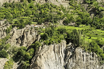 The 112 km drive from Gilgit to Karimabad in the central Hunza Valley takes about three hours. Terraced fields and orchards are typical for the capital of the Hunza Valley. The panorama at Karimabad is extraordinary as it covers Diran, Golden Peak (Spantik), Hispar Muztagh and Ultar Muztagh.
