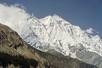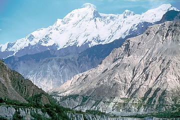 First view of Rakaposhi ('fish tail' - 7788 m) and its west face. The difference in altitude between the Hunza River and the summit is more than 6000 m. The picture was taken halfway between Gilgit and Karimabad from a viewpoint near Sikandarabad. The north face of Rakaposhi (right picture) was first climbed in 1958 by a British-Pakistani Expedition.