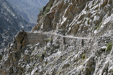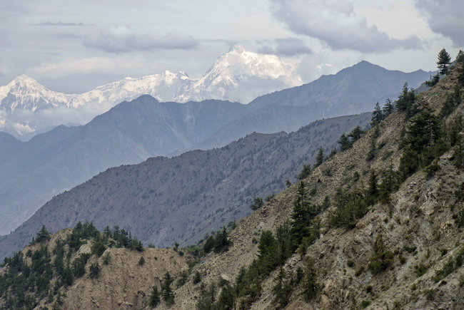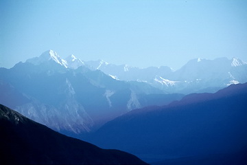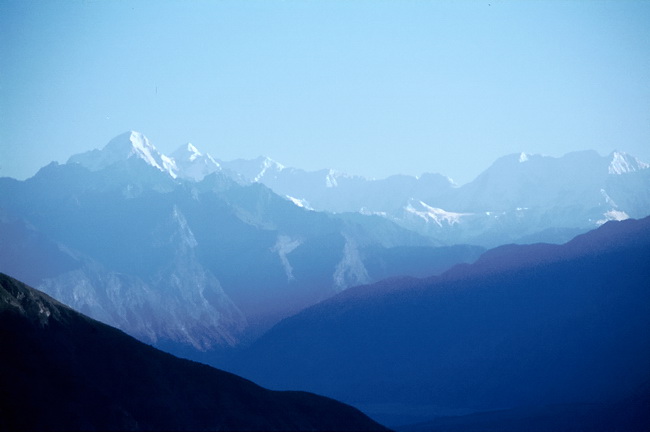 In the meantime a gravel road has been built to connect Tato and the Indus Valley. The dominating peak in the center behind the Buldar Ridge is Malubiting (7458 m).