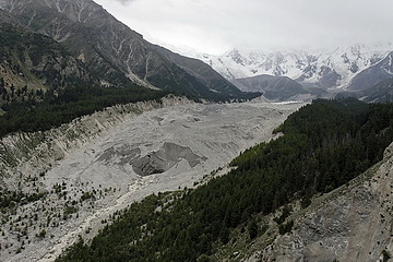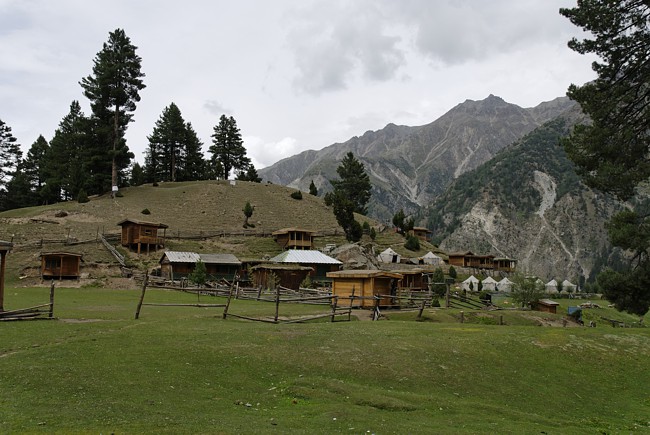 From Tato another 700 m have to be climbed until Fairy Meadows is reached just above the tongue of the Rakhiot Glacier. The name was given to this place by the first expeditions because of the beautiful scenery with forests and blooming alpine meadows. In the meantime nice little 'appartements' are available even at Fairy Meadows.