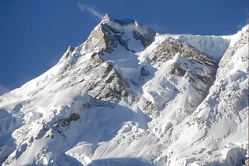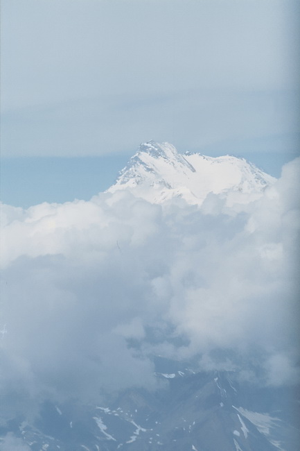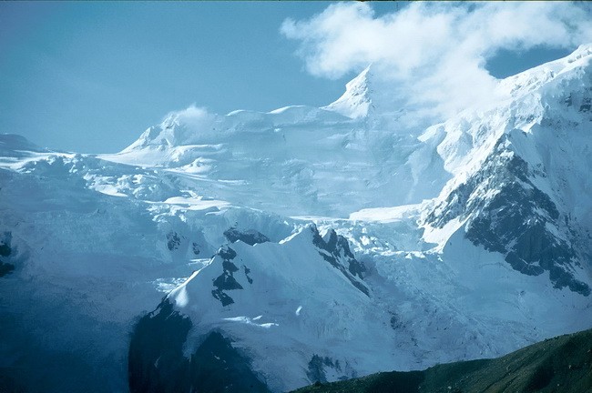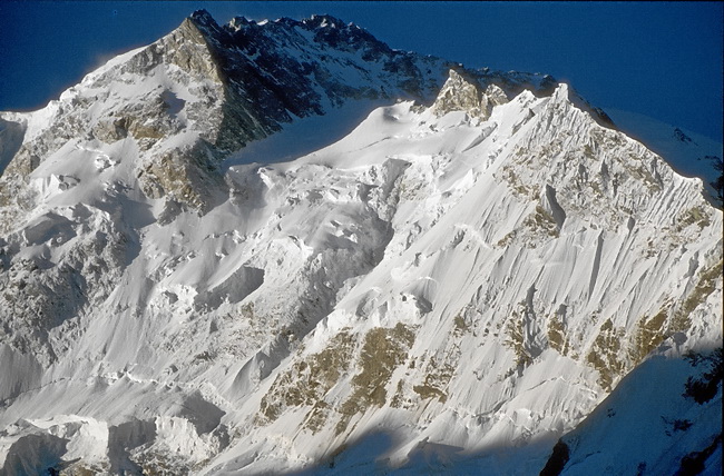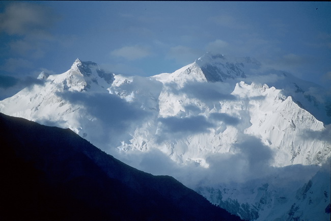 The highest visible point of Nanga Parbat is the north summit (7816 m) at the right end of the shady ridge. The main summit is hidden behind this ridge. The Silver Saddle which Hermann Buhl had to cross during the first ascent of Nanga Parbat lies just behind the eastern summit (7597 m).